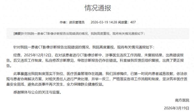 3月19日,南方医科大学南方医院发布情况通报:针对我院一患者CT影像诊断报告出现错误的情况,我院高度重视。经查,2025年12月12日,在对该患者进行CT影像诊断中,涉事医生违反工作流程,未复核结果,出具错误报告。后又违反工作制度,私自修改诊断意见,导致诊断报告仍存在错误。科室接到反馈后组织复核,出具了更正报告。此事暴露出我院制度落实不到位、医疗质量管理存在疏漏,我们深感愧疚,已第一时间向患者诚恳致歉,依法依规与患者协商解决方案,对相关责任人进行严肃处理,并举一反三,严格落实各项工作流程和制度,坚决筑牢医疗质量安全底线,避免此类事件再次发生,全力保障群众健康权益。