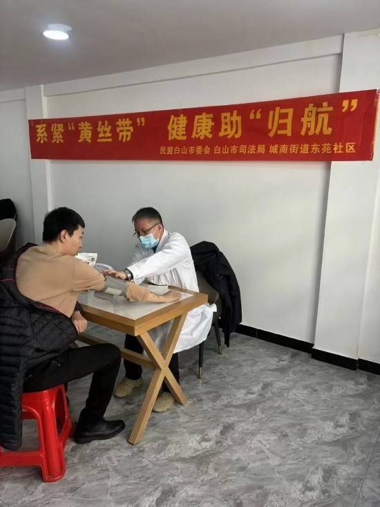12月26日,白山市司法局联合民盟白山市委会、浑江区司法局在浑江区城南街道东苑社区共同启动“系紧‘黄丝带’,健康助‘归航’”健康义诊和爱心捐赠活动。活动以关心关爱,促进回归为目标,向社区矫正对象讲解医保政策,特邀市民盟医疗专家现场义诊赠药,将专业健康服务送到社区矫正对象“家门口”,用贴心举措传递社会包容与帮教温度。